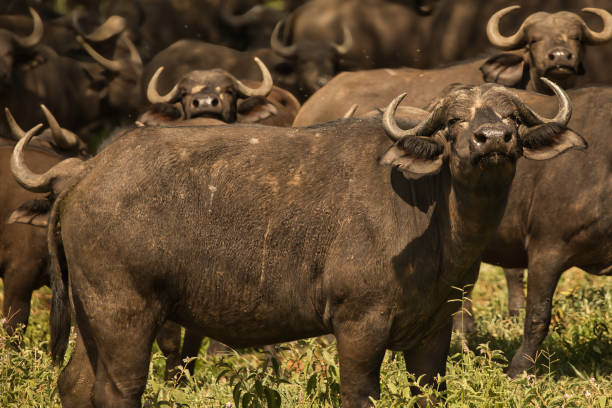 Buffalo are known for their strength and defensive behavior, often standing together to protect themselves from predators such as lions.